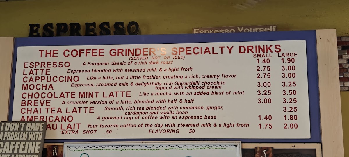 The Coffee Grinder in Jacksonville stands out as more than just a coffee shop—it’s a vibrant hub blending rich espresso culture with live music and art. Their menu highlights expertly roasted varietals, like the smooth Colombia Supremo and the subtly chocolate-kissed Guatemala Antigua. Each cup, from classic espressos to frothy cappuccinos and indulgent mochas, captures a perfect balance of flavor and texture.